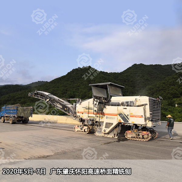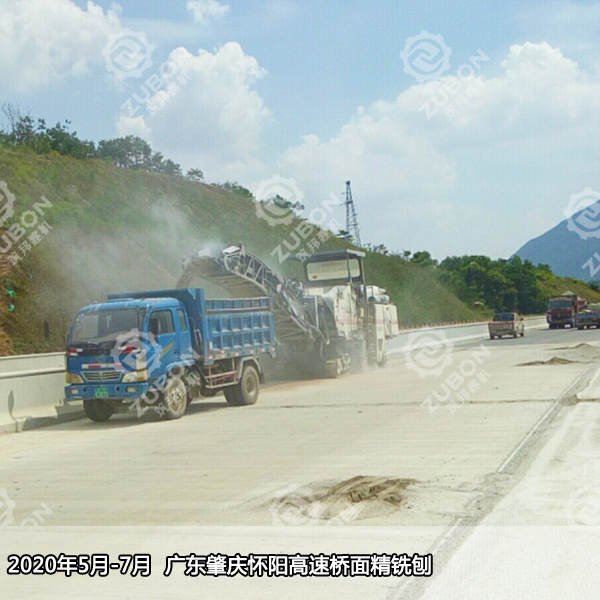 廣東肇慶懷陽高速全線橋面精銑刨,精銑刨總面積近500000㎡,工期2個月;本項目上陣的是維特根精銑刨機W2000配334把刀頭和清掃機。